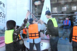 団員が楽しみにしていたヨット訓練では、まずカバー外しから艤装作